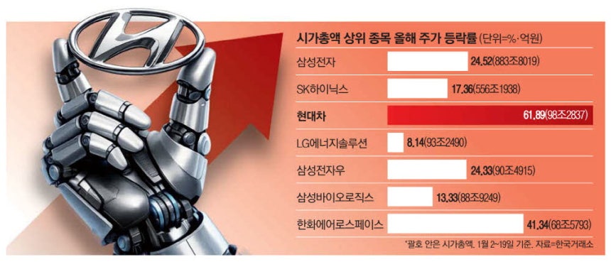 Çö´ëÀÚµ¿Â÷´Â À̳¯ ½Ã°¡ÃÑ¾× 3À§·Î´Â ÀÌ·ÊÀûÀÎ ¼öÁØÀÎ 16.22%³ª ±ÞµîÇϸç 48¸¸¿ø¿¡ °Å·¡¸¦ ¸¶ÃÆ´Ù. ½ÃÃÑÀº À̳¯ 100Á¶¿øÀ» ¸ñÀü¿¡ µÐ ¼öÁرîÁö ¿Ã¶ó¼¹´Ù. Áö³ÇØ ÄÚ½ºÇÇ ºÒÀå¿¡¼ »ó´ëÀûÀ¸·Î ¼Ò¿ÜµÆ´ø Çö´ëÂ÷´Â ¿Ã µé¾î ÆÄÁ×Áö¼¼´Ù. Çö´ëÂ÷ ÁÖ°¡ È帧ÀÇ ±ØÀû ÀüȯÀº ·Îº¿¿¡¼ ÀÌ·ïÁ³´Ù. ÀÌ´Þ ÃÊ ¹Ì±¹¿¡¼ ¿¸° CES¿¡¼ °è¿»ç º¸½ºÅÏ´ÙÀ̳»¹Í½º°¡ ÈÞ¸Ó³ëÀÌµå ·Îº¿ '¾ÆÆ²¶ó½º'¸¦ ¼±º¸ÀÎ ÀÌÈÄ 'ÇÇÁöÄà AI' ±â¾÷À¸·Î¼ ÀçÆò°¡¹Þ°í ÀÖ´Ù. ¿Ã µé¾î »ó½Â·ü¸¸ ³õ°í ºÁµµ ÄÚ½ºÇÇ(14.9%) ´ëºñ ¹è°¡ ³Ñ´Â 39.3%¿¡ ´ÞÇÑ´Ù. Çö´ëÂ÷ ÁÖ°¡ ¿À¸§¼¼°¡ ´çºÐ°£ Áö¼ÓµÉ °ÍÀ̶õ Àü¸ÁÀÌ À̾îÁö°í ÀÖ´Ù. °è¿»çÀÎ ±â¾Æ¿Í Çö´ë¸ðºñ½º µîµµ '¾ÆÆ²¶ó½º¹ß ÀçÆò°¡' ´ë¿¿¡ ÇÕ·ùÇß´Ù. ±â¾Æ´Â 19ÀÏ 12.18%³ª Ä¡¼ÚÀ¸¸é¼ 58Á¶¿øÀÌ´ø ½ÃÃÑÀ» 66Á¶¿ø±îÁö ºÎÇ®·È´Ù. Çö´ë¸ðºñ½º¿Í Çö´ë±Û·Îºñ½ºµµ ³ª¶õÈ÷ 6%´ë »ó½Â·üÀ» ±â·ÏÇß´Ù. Çö´ëÂ÷ ¿Ü¿¡µµ À̳¯ ÄÚ½ºÇÇ ½ÃÃÑ »óÀ§ 10À§±Ç Áß »ï¼ºÀüÀÚ ¿ì¼±ÁÖ¿Í »ï¼º¹ÙÀÌ¿À·ÎÁ÷½º¸¦ Á¦¿ÜÇÑ ¸ðµç Á¾¸ñÀÌ »ó½Â ¸¶°¨Çß´Ù. LG¿¡³ÊÁö¼Ö·ç¼ÇÀº 1.92%, ÇÑÈ¿¡¾î·Î¹Ð¾çÃâÀå¼¥ °í¾çÃâÀå¼¥½ºÆäÀ̽º¿Í HDÇö´ëÁß°ø¾÷Àº °¢°¢ 2.39%, 4.18% ¿Ã¶ú´Ù. »õÇØ µé¾î ½ÃÃÑ 10À§±Ç ¸ðµç Á¾¸ñÀÌ ÃÖÀú 8%¿¡¼ ÃÖ´ë 60%±îÁö ¿À¸£¸é¼ Áö¼ö¸¦ °ßÀÎÇß´Ù. ¿ÃÇØ µé¾î À̳¯±îÁö ±¹³» Áõ½Ã ´ëÀåÁÖ »ï¼ºÀüÀÚ ÁÖ°¡´Â 24.52% »ó½ÂÇß´Ù. »ï¼ºÀüÀÚ ¿ì¼±ÁÖµµ 24.33% ¿À¸£¸ç ½ÃÃÑ 90Á¶¿øÀ» µ¹ÆÄÇß´Ù. ![]() |